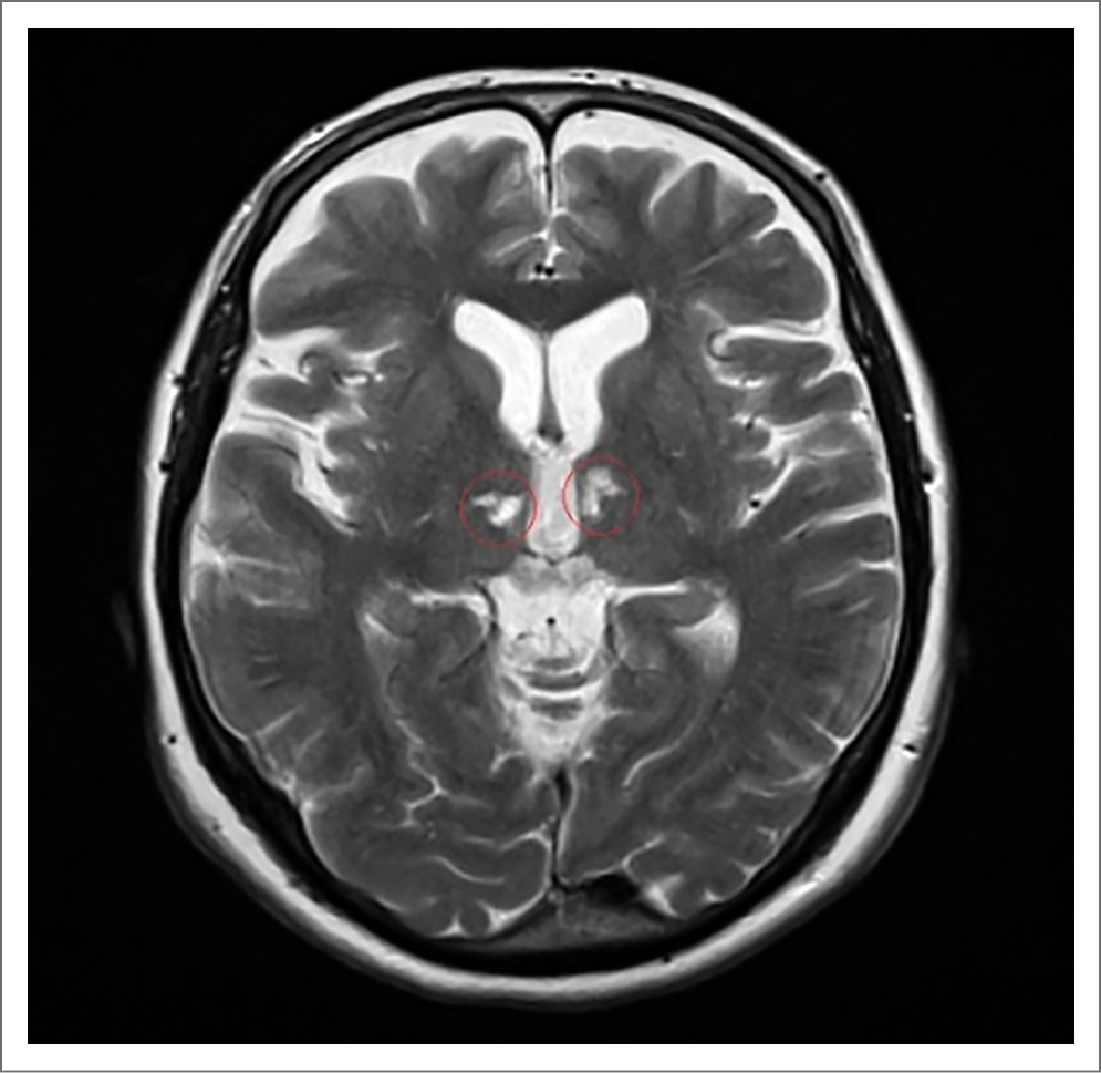 Рис. 4. Пациентка С., 73 года. МРТ-исследование ГМ 04.03.2021: аксиальные МР-сканы последовательности Т2-ВИ, симметричный гиперинтенсивный МР-сигнал от правого и левого таламуса.