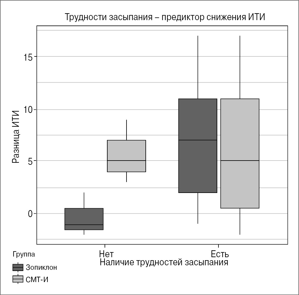 Рис. 1. Трудности засыпания – предиктор снижения ИТИ в разных группах лечения. Диаграмма отражает разброс показателя эффективности (снижение ИТИ после курса лечения) в группах, получавших фармакотерапию и СМТ-И, в зависимости от того, отмечали пациенты трудности засыпания или нет: медиану, 25, 75-й процентили, минимальное и максимальное значения.