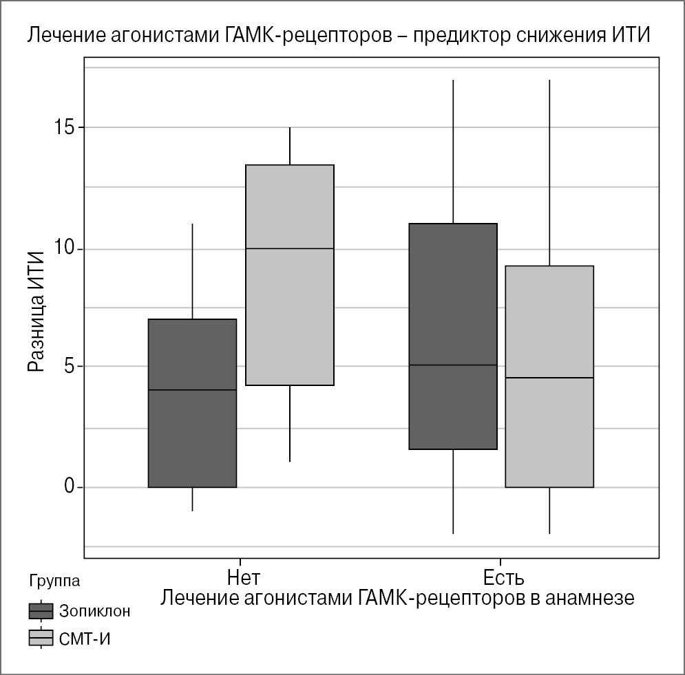 Рис. 2. Лечение агонистами ГАМК в анамнезе – предиктор снижения ИТИ в разных группах лечения. Диаграмма отражает разброс показателя эффективности (снижение ИТИ после курса лечения) в группах, получавших фармакотерапию и СМТ-И, в зависимости от того, принимали пациенты в прошлом агонисты ГАМК-рецепторов или нет: медиану, 25, 75-й процентили, минимальное и максимальное значения.