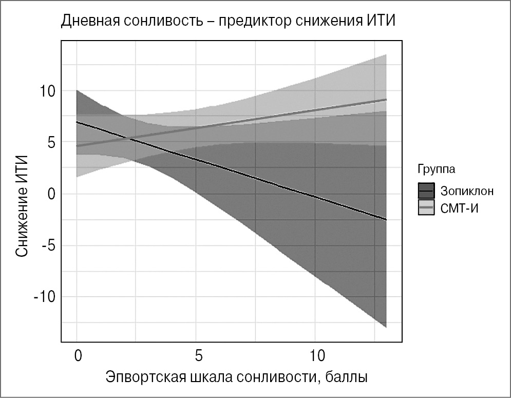 Рис. 3. Дневная сонливость – предиктор снижения ИТИ в разных группах лечения. Линии регрессии на графике отражают зависимость показателя эффективности (снижение ИТИ после курса лечения) в группах, получавших фармакотерапию и СМТ-И, от фонового уровня сонливости по Эпвортской шкале сонливости. Закрашенная область вокруг линий регрессии отражает 95% доверительный интервал.