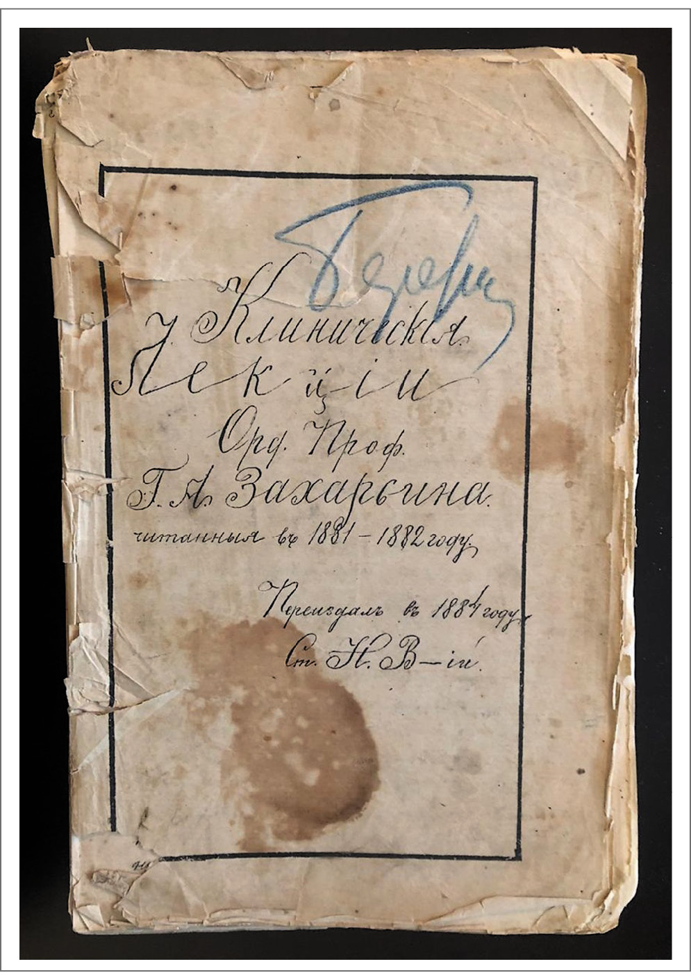 Рис. 1. Обложка рукописи клинических лекций из библиотеки директоров Факультетской терапевтической клиники.