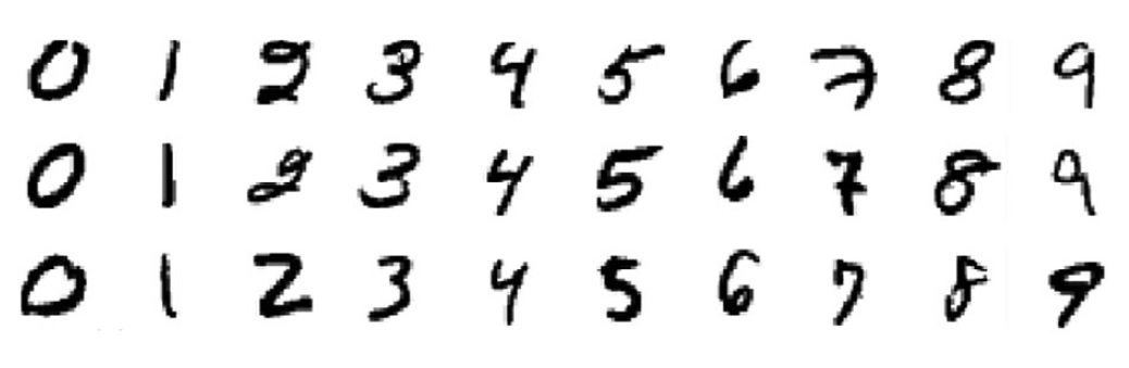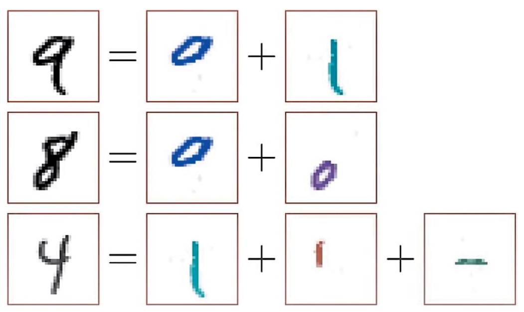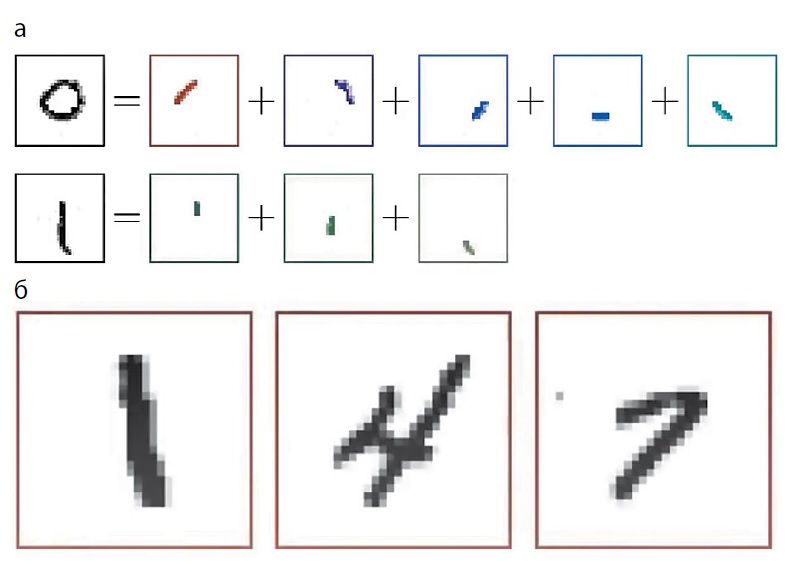 Рис. 4: а – пример возможных фрагментов рукописных цифр, активирующих один из скрытых слоев перцептрона; б – демонстрация схожести расположения фрагментов данных (схожесть написания) в разных рукописных цифрах.