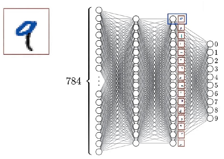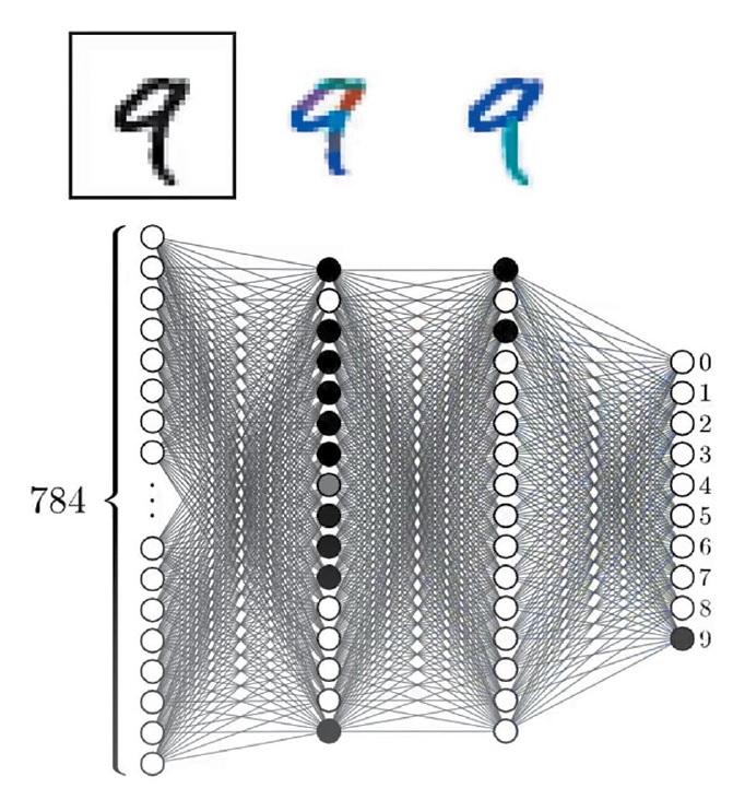 Рис. 5. Вариант активации скрытых слоев перцептрона, ведущий к результату классификации – цифре 9.