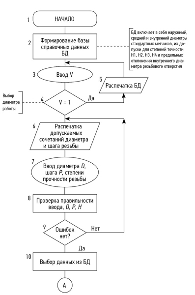 Рис. 2. Блок-схема алгоритма расчета комбинированного инструмента зенкер-метчик. БД ― база данных; D ― диаметр; Р ― шаг резьбы; Н ― степень прочности.