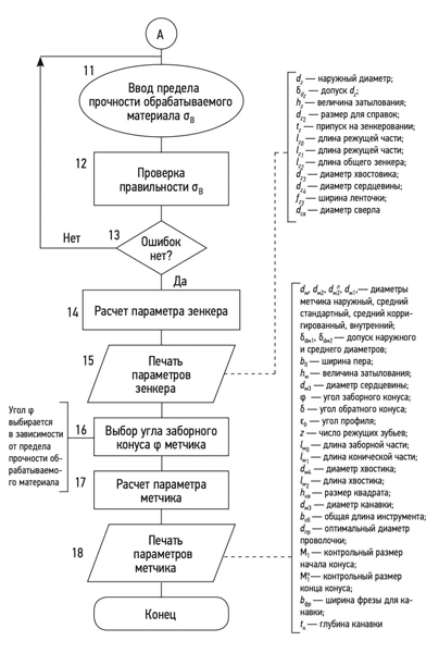 При создании 3D-модели комбинированного инструмента зенкер-метчика важнейшим этапом в процессе является создание модели объекта, максимально приближенной по своим параметрам к параметрам объекта, которое носит название трехмерное моделирование [8]. Для создания 3D-модели (монолитная модель) комбинированного инструмента зенкер-метчика была разработана блок-схема расчета параметров и блок-схема алгоритма с заданной программой, а для изготовления в производственных условиях разработан код и программа для модели. Для примера на основании использования блок-схемы расчета (рис. 2) и блок-схемы алгоритма с заданной программой (рис. 3) провели расчет параметров метчика для нарезания резьбы М14 с шагом Р = 2,00 мм, результаты которого представлены в табл. 1.