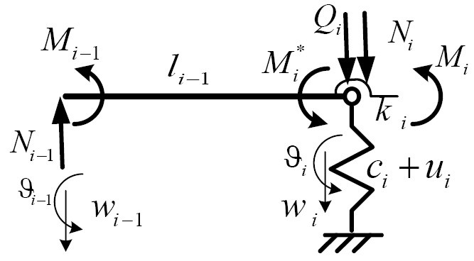 На рис. 3 введены обозначения: u = −ω2mi — жесткость i-й опоры, Qi, — амплитудные значения внешних поперечных сил и изгибающих моментов, приложенных в -м шарнире безынерционной модели. Вид i-го элемента с обозначением параметров его деформирования изображен на рис. 4.