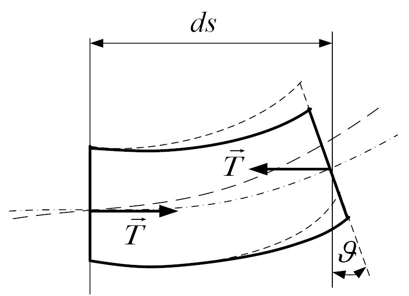 Как уже было сказано выше, влияние слагаемых четвертой группы может быть учтено непосредственно при выводе формул для ПО и ПП. В качестве первого опыта такого учета в работах [4, 5] был выполнен учет влияния на параметры вибрации плоской квазистатической конечно-элементной модели квазистатической продольной силы. Структуру дополнительных усилий, индуцируемых постоянной по величине и направлению продольной сжимающей силы T, действующей на элемент модели длиной ds, можно записать, рассмотрев рис. 7.