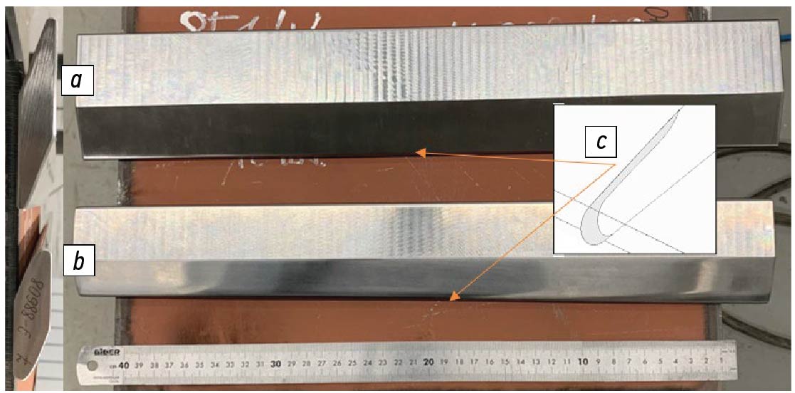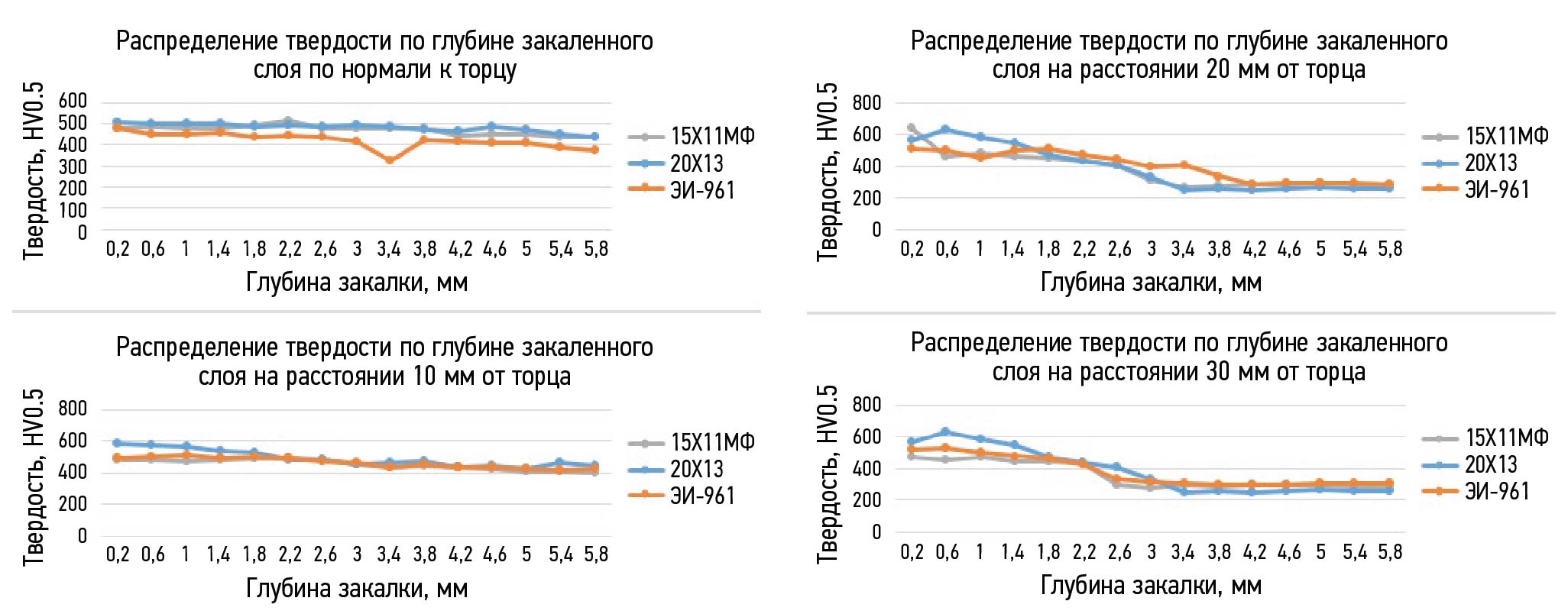 RESULTS: We obtained a single hardening zone on the leading edge and the adjacent section on the back of the test pieces with no defects, i.e. microcracking, discontinuities, and surface glazing. Hardness within the boundaries of the hardened layer on the leading edge side is at least 400 HV0.5. In this case, the hardened layer depth in the area of the leading edge is at least 5 mm and at least 2 mm in the adjacent section of the blade back. The maximum test piece deformation after strengthening is 1.2 mm.