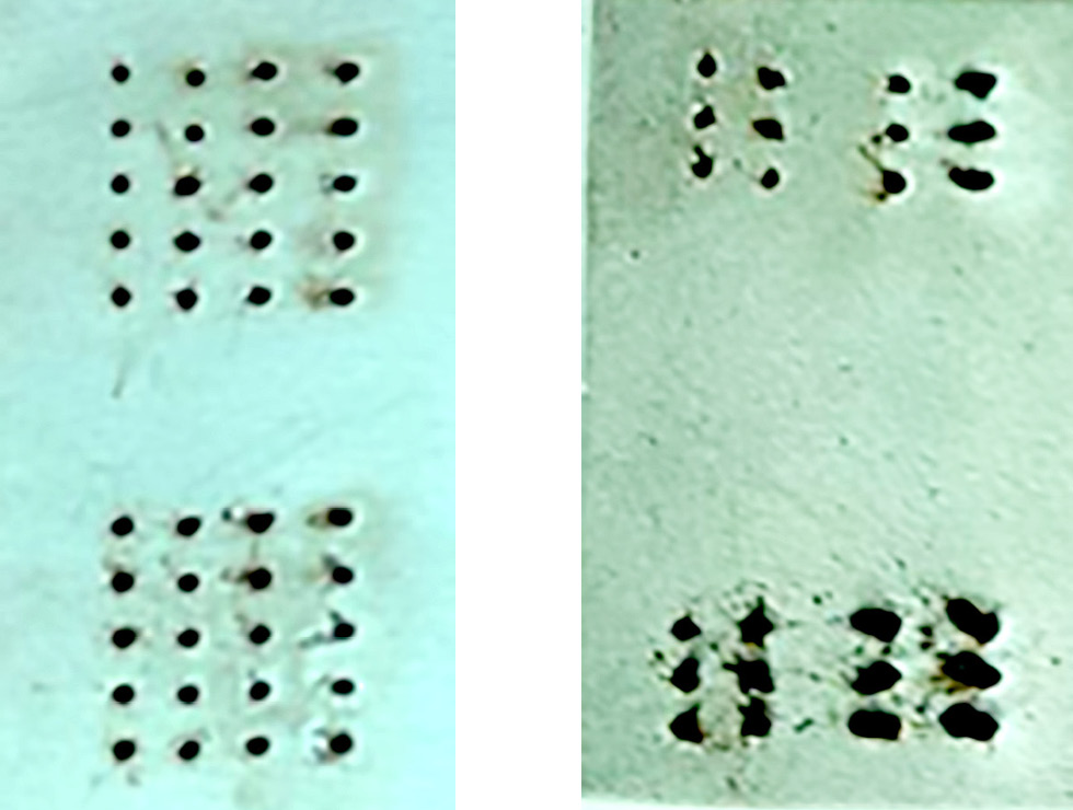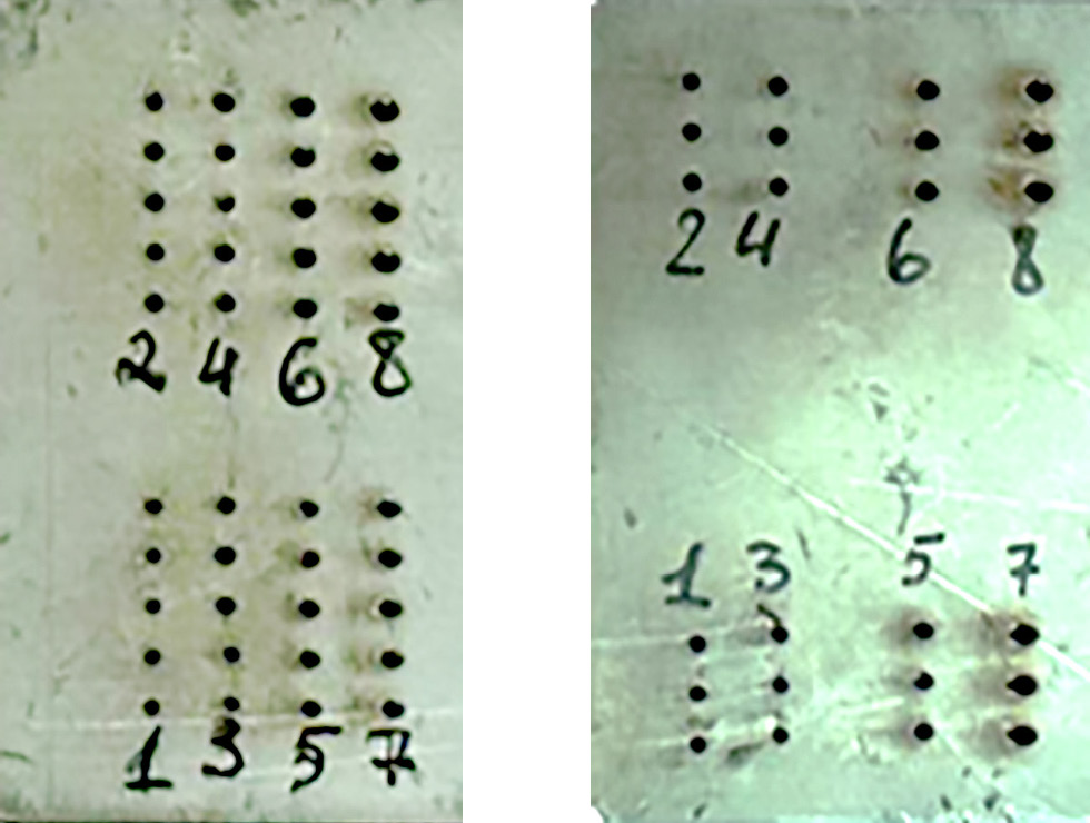 В ходе второй серии эксперимента было выполнено сверление двух образцов с использованием объектива с фокусным расстоянием 145 мм. Один из образцов был покрыт пастой с нитридом бора для оценки влияния антипригарного покрытия на высоту выплесков. Было просверлено по восемь матриц отверстий на каждом образце, используя одинаковые технологические режимы, но при различной стратегии сверления. Четные ряды — трепанирование, нечетные — по оффсетной стратегии. Общий вид образцов приведен на рис. 5, 6.