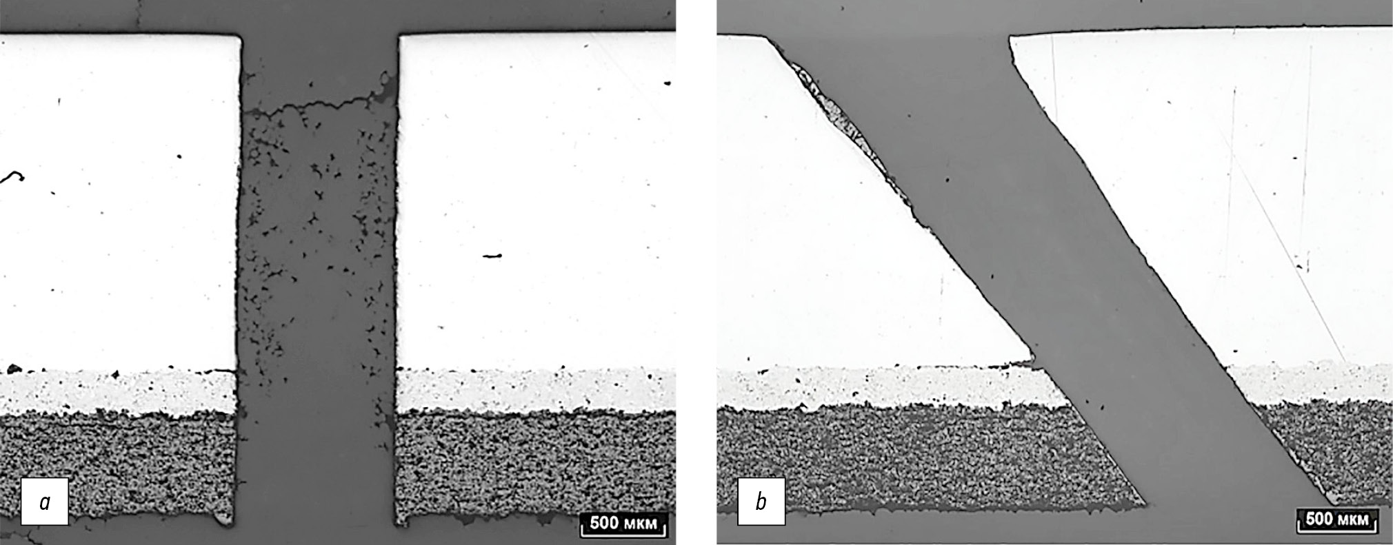 Рис. 7. Микрошлифы отверстий: а — 90° к поверхности; b — 40° к поверхности.