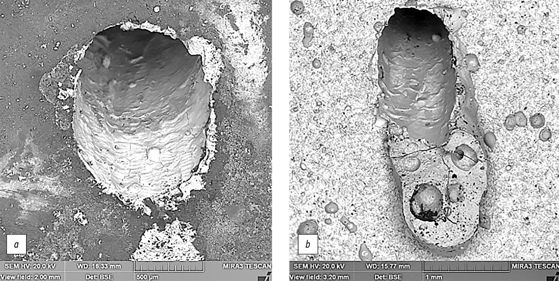 Рис. 8. Сравнение качества отверстий, просверленных под углом 40° к поверхности. Вид со стороны выхода лазерного излучения: а — образец, покрытый пастой; b — образец без пасты.