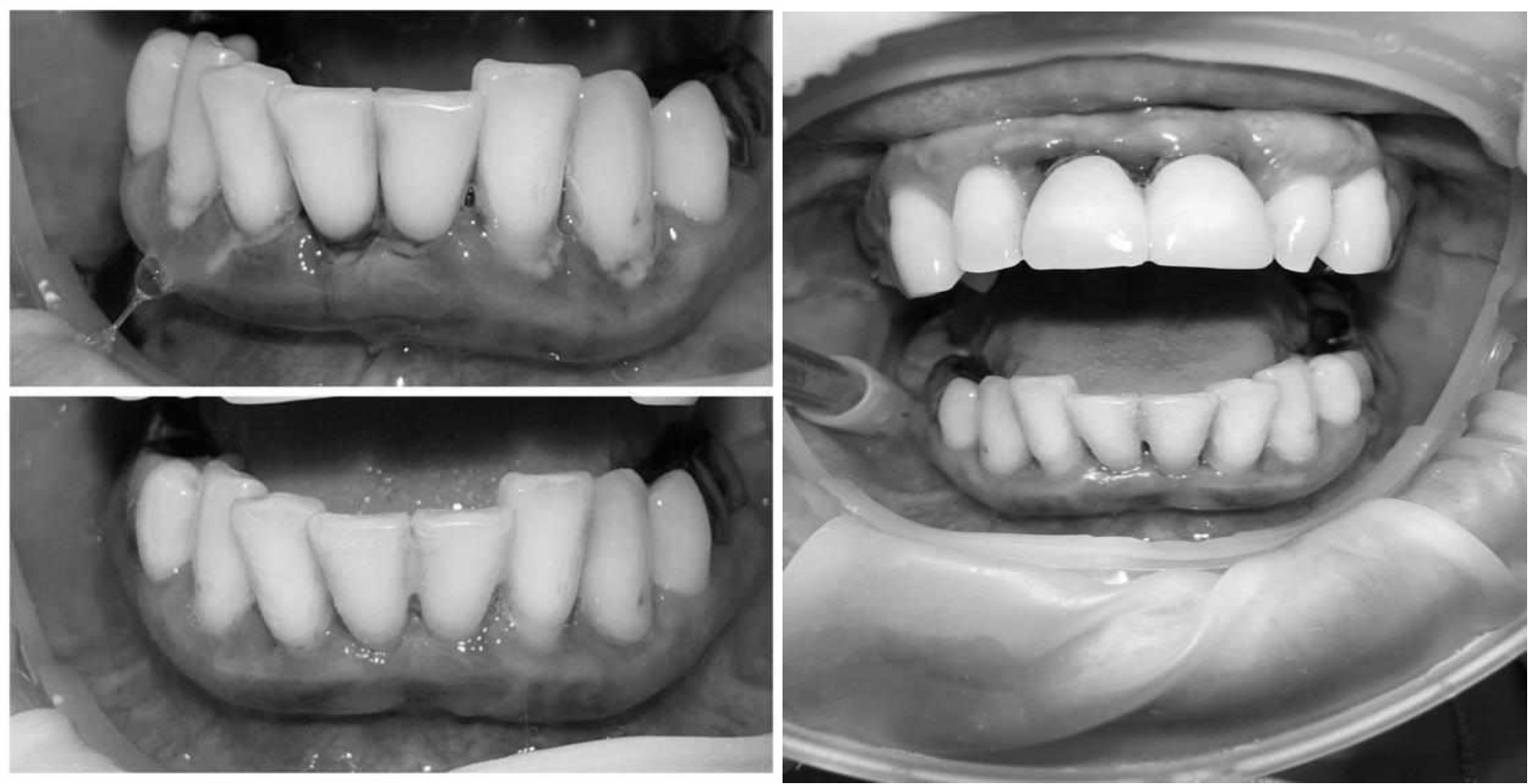 Через 6 месяцев при осмотре выявлен удовлетворительный уровень индивидуальной гигиены, отсутствие участков кровоточивости и гноетечения (рис. 4), пародонтальные карманы уменьшились в размерах (рис. 5). Пациент отмечает значительные улучшения. После стабилизации пародонтологического статуса пациент направлен для дальнейшего ортопедического лечения.