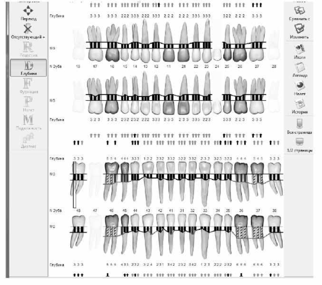 Учитывая, что достаточно большое количество показателей необходимо отметить в пародонтальной карте пациента, был создан программно-диагностический комплекс Florida Probe (Florida Probe Corporation, США). Он состоит из программного обеспечения, электронного зонда и ножного переключателя, с помощью которого фиксируется глубина зондирования, кровоточивость и гноетечение. Компьютер воспроизводит голосовое сообщение о наличии кровоточивости десен, глубине кармана, гноетечении и подвижности зубов. После проведения зондирования программа составляет пародонтограмму, в которой будут указаны все необходимые данные о состоянии пародонта. Отметив зубы с имеющимся зубным налетом, программа посчитает гигиенический индекс. Плюсом использования данной программы является то, что в ней сохраняются предыдущие исследования, что необходимо для оценки успеха лечения и динамики заболевания. Наглядная демонстрация результатов обследования повышает мотивацию для пациента. Также в программе имеются информационные видеоролики для пациента [9, 10].