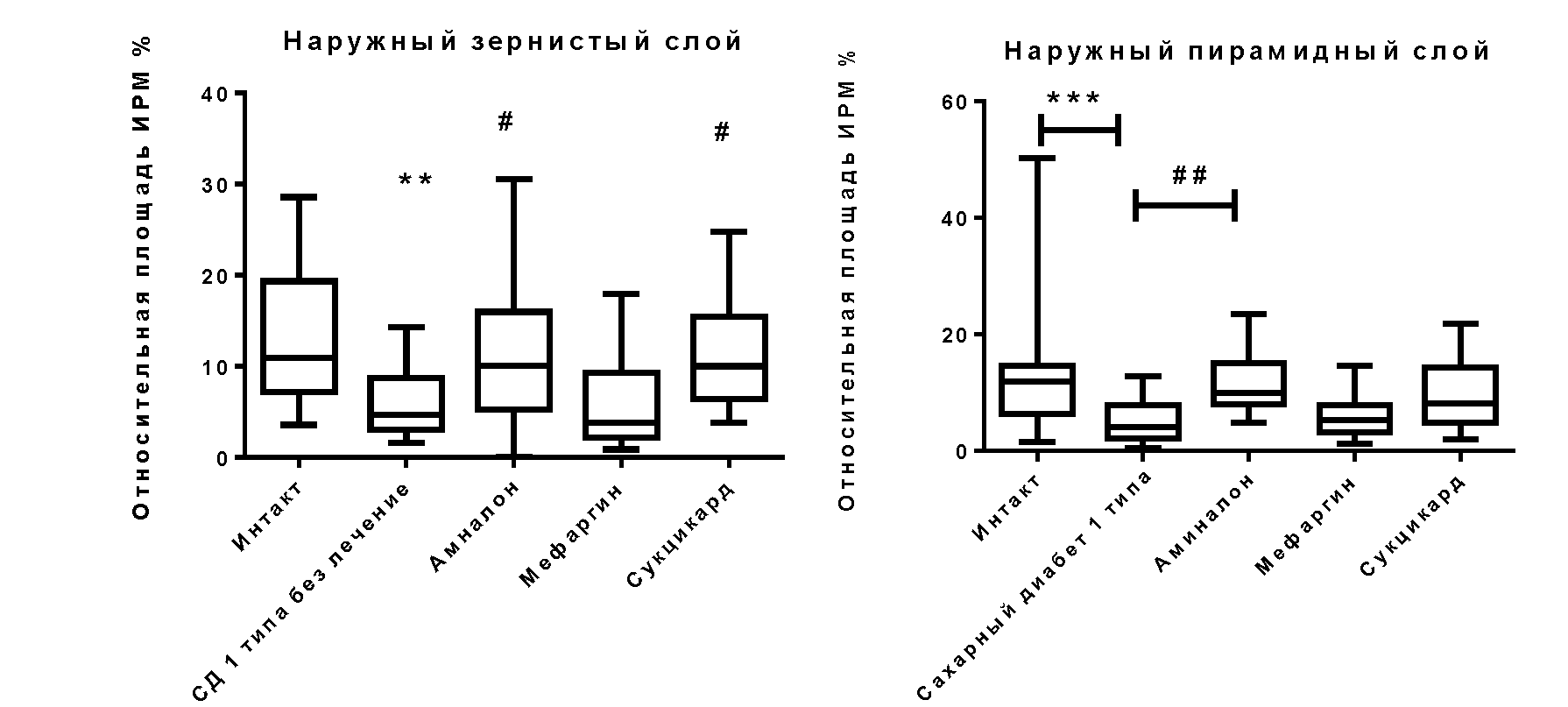 У крыс группы № 1 (интакт) в наружном зернистом слое моторной коры относительная площадь ИРМ составила 10,91 % (7,17–19,34), в группе № 2 (СД I + физ. р-р) – 4,65 % (3,06–8,76), что продемонстрировало достоверное снижение относительной площади ИРМ в группе № 2 (СД I + физ. р-р) на 6,26 % (p < 0,05). Относительная площадь ИРМ в наружном зернистом слое в группе № 3 (СД I + аминалон) составила 10,03 % (5,28–15,97).