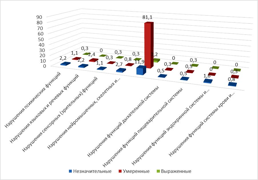 В целом у детей, направленных на МСЭ, выявлены в 26,1 % – незначительные нарушения функций организма, 86,8 % – умеренные, в 4,3 % – выраженные.