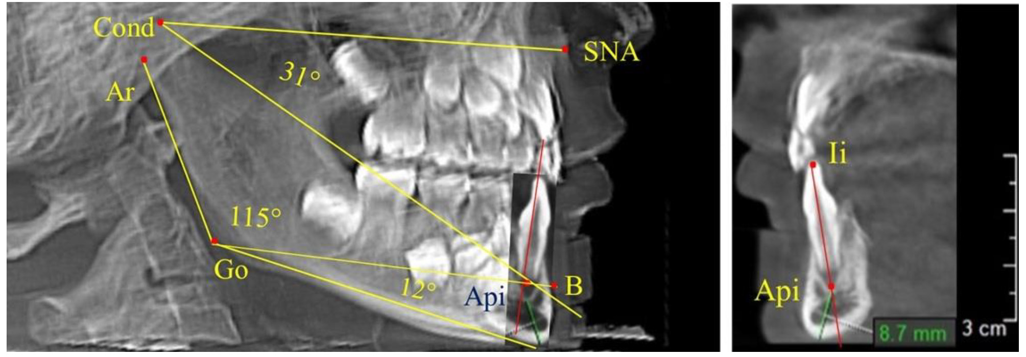 Через апикальную точку нижнего резца от суставной точки проводили линию Cond-Api, которая с линией Cond-SNA образовывала угол гнатический части лица SNA-Cond-Api, используемый для оценки ее основных параметров.
