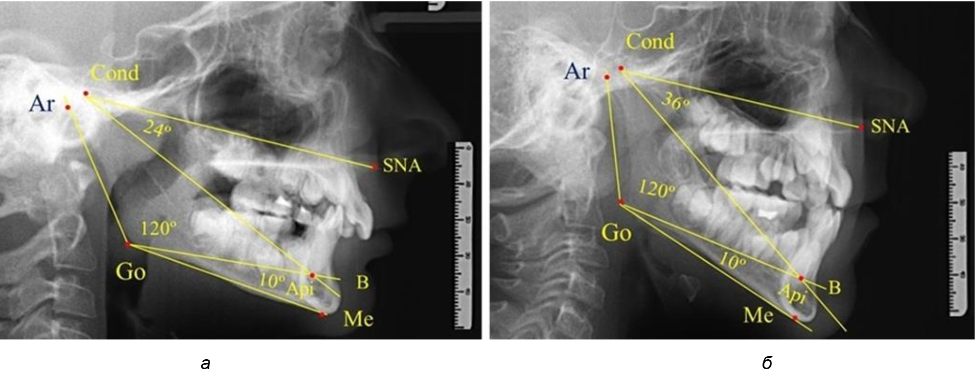 Рис. 1. Расположение реперных точек (а) и линий (б) для оценки угловых параметров гнатической части телерентгенограммы