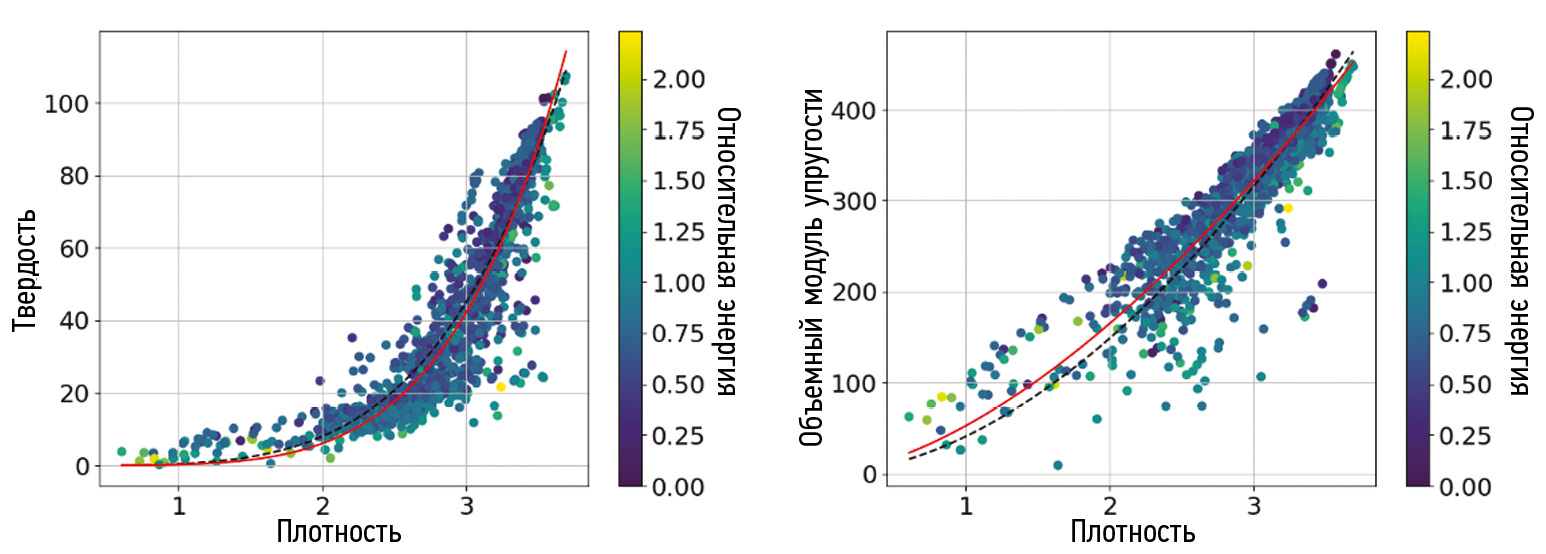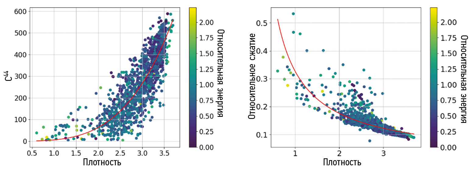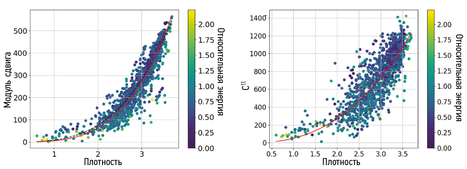 Результаты. В результате работы определены зависимости объемного модуля упругости, модуля сдвига, твердости, независимых элементов матрицы упругих постоянных с12, с44 от плотности. А также были уточнены зависимости, найденные ранее в работе [7]. Эти зависимости представлены в рис. 1–3. Красной линией помечены найденные зависимости, пунктирной линией отмечены зависимости из литературных данных. Также цветом отмечена относительная энергия структуры от энергии алмаза.