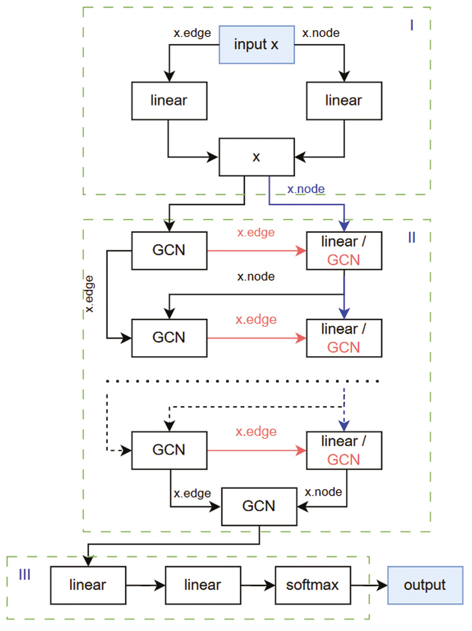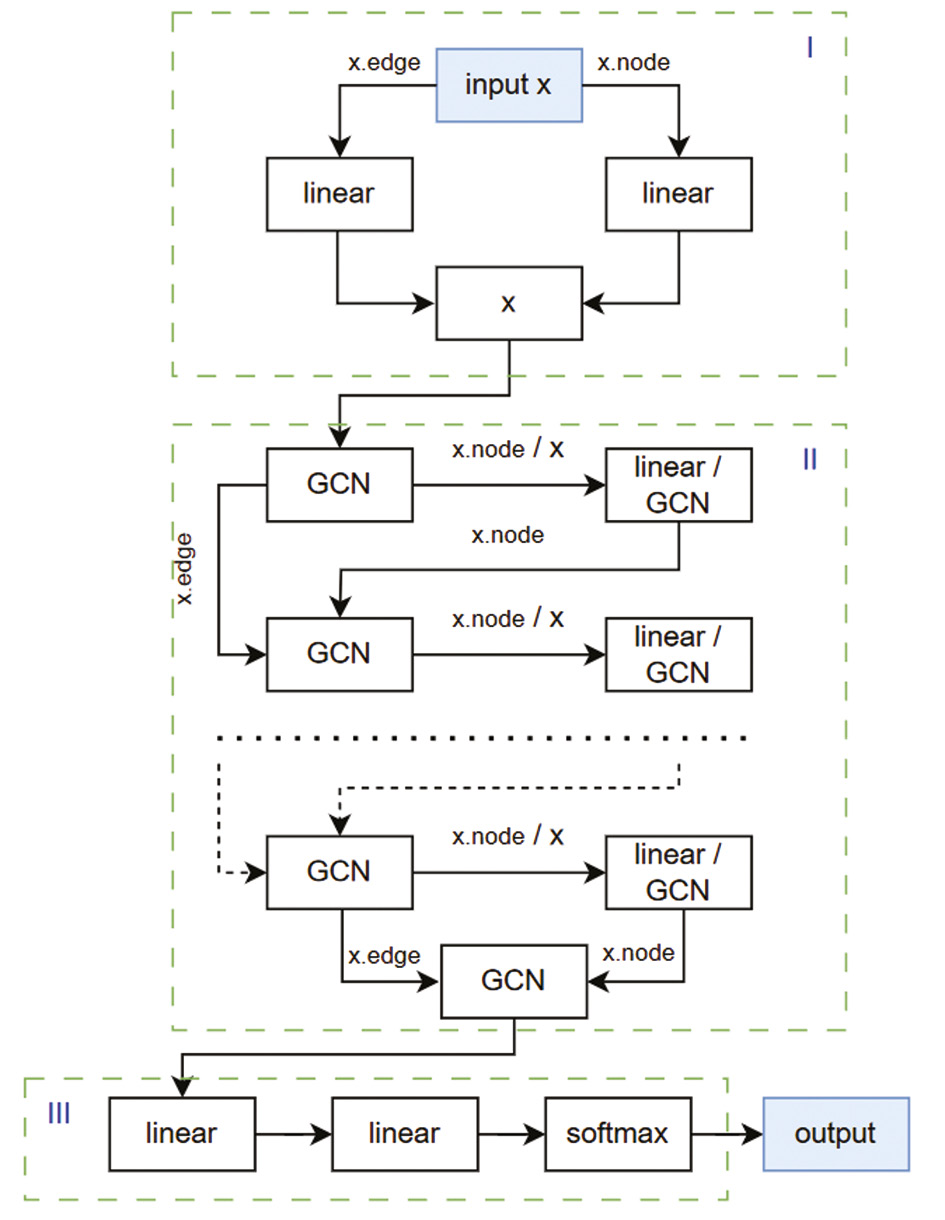 Подробная схема нейронной сети с дополнительными слоями представлена на рисунке 1. Она поделена на три части. Первая часть отвечает за преобразование с использованием полносвязного слоя отдельно вершин-ребер и отдельно вершин-узлов. Во второй части вспомогательные слои используются после слоев GCN, используя обновленные признаки для узлов (случай полносвязного слоя) или как признаки для узлов, так и признаки для ребер (случай сверточного слоя). Таким образом, имеется возможность модификации признаков узлов для более удачного их представления в дальнейшем процессе агрегации. Третья часть неизменна и ответственна за формирование ответа в виде one-hot-вектора с дальнейшим выбором элемента с максимальным значением.