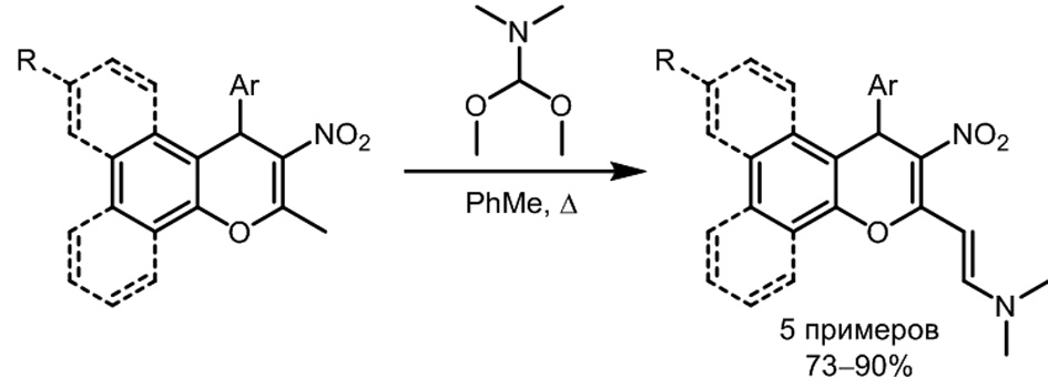 Предполагая, что полученные 4Н-хромены обладают повышенной СН-кислотностью, было предложено ввести их в реакцию с диметилацеталем ДМФА. В результате был синтезирован ряд α[2(диметиламино)винил]-β-нитрозамещенных бензохроменов с выходами 73–90 %, как незамещенных по метиленовому мостику, так и содержащих арильный заместитель (рис. 2).