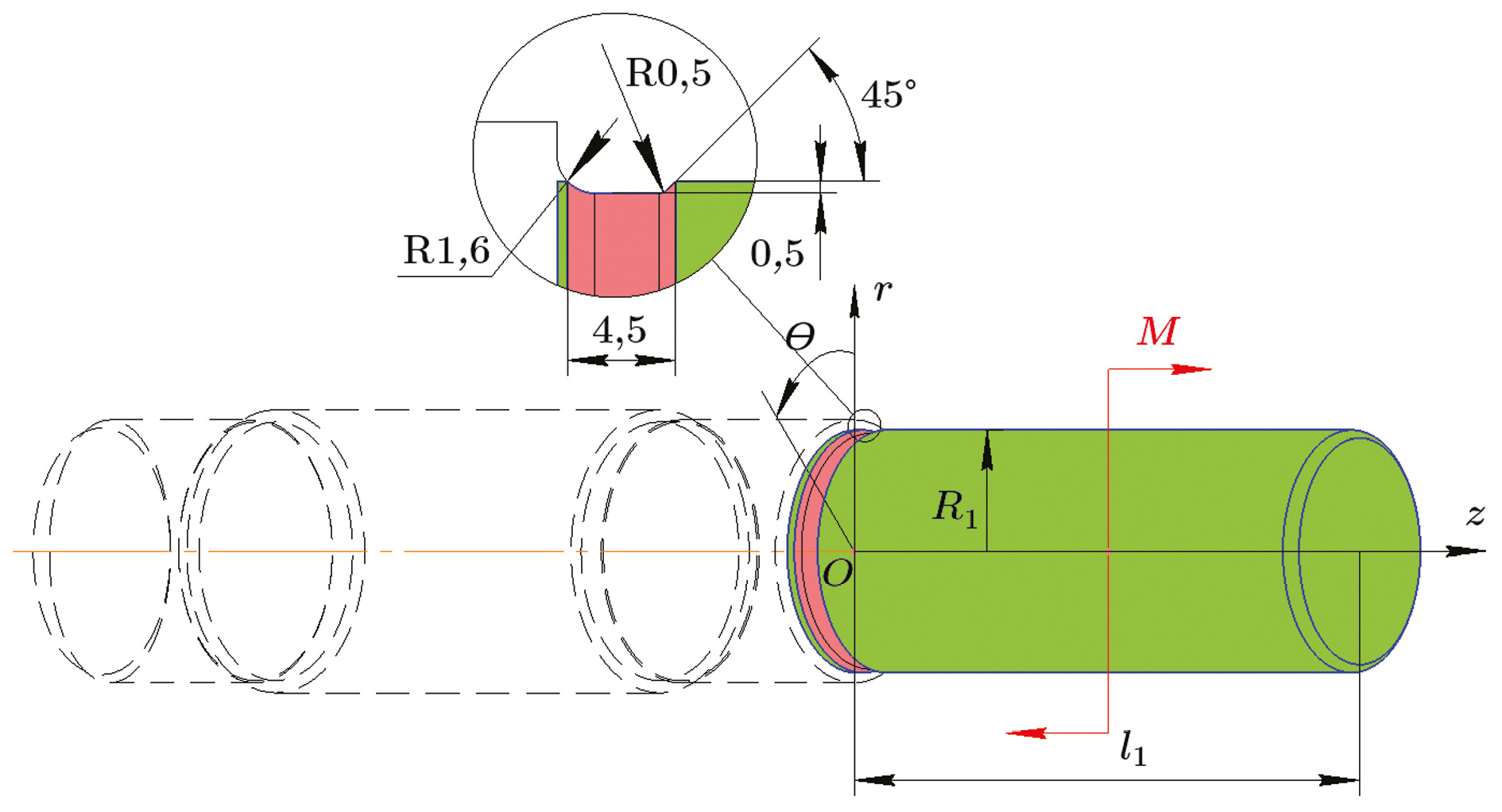 Цель ― исследовать эффективность наведения методом ОППД сжимающих ОН на примере гидродробеструйной обработки (ГДО) сплошного цилиндрического образца из стали 45 радиусом R1 = 30 мм и длиной l1 = 122 мм с концентратором напряжений в виде канавки для выхода шлифовального круга, имитирующего нагруженную изгибающим моментом M = 472,4 Н∙м поверхностно упрочненную часть ступенчатого вала редуктора (рис. 1).