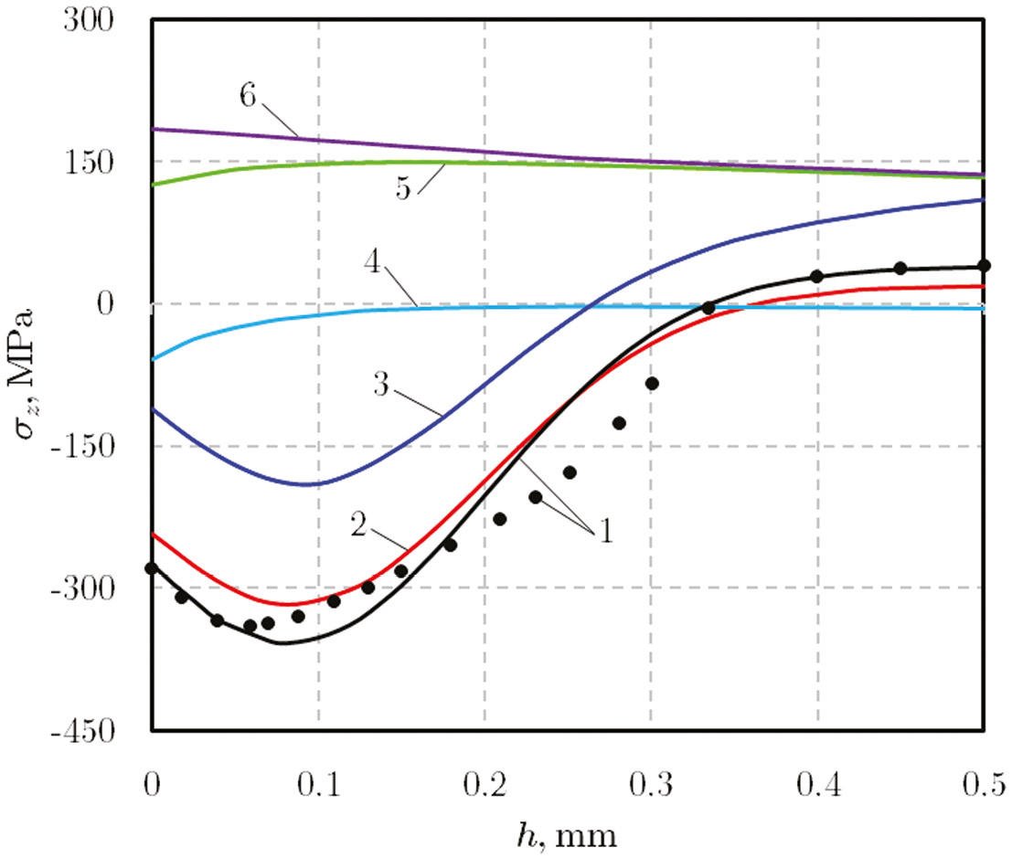 Выводы. Анализ распределения ОН по компоненте σz = σz(h) для всех рассматриваемых моделей упрочненных образов демонстрирует хорошее сближение с данными эксперимента, что говорит об адекватности численного подхода. Наличие технологического концентратора напряжений оказывает серьезное влияние на напряженное состояние в приповерхностном упрочненном слое. Тем не менее эффективность применения упрочнения нагруженного цилиндрического образца по сравнению с неупрочненной структурой в пределах 250 мкм от наружной поверхности достигает 32 %.
