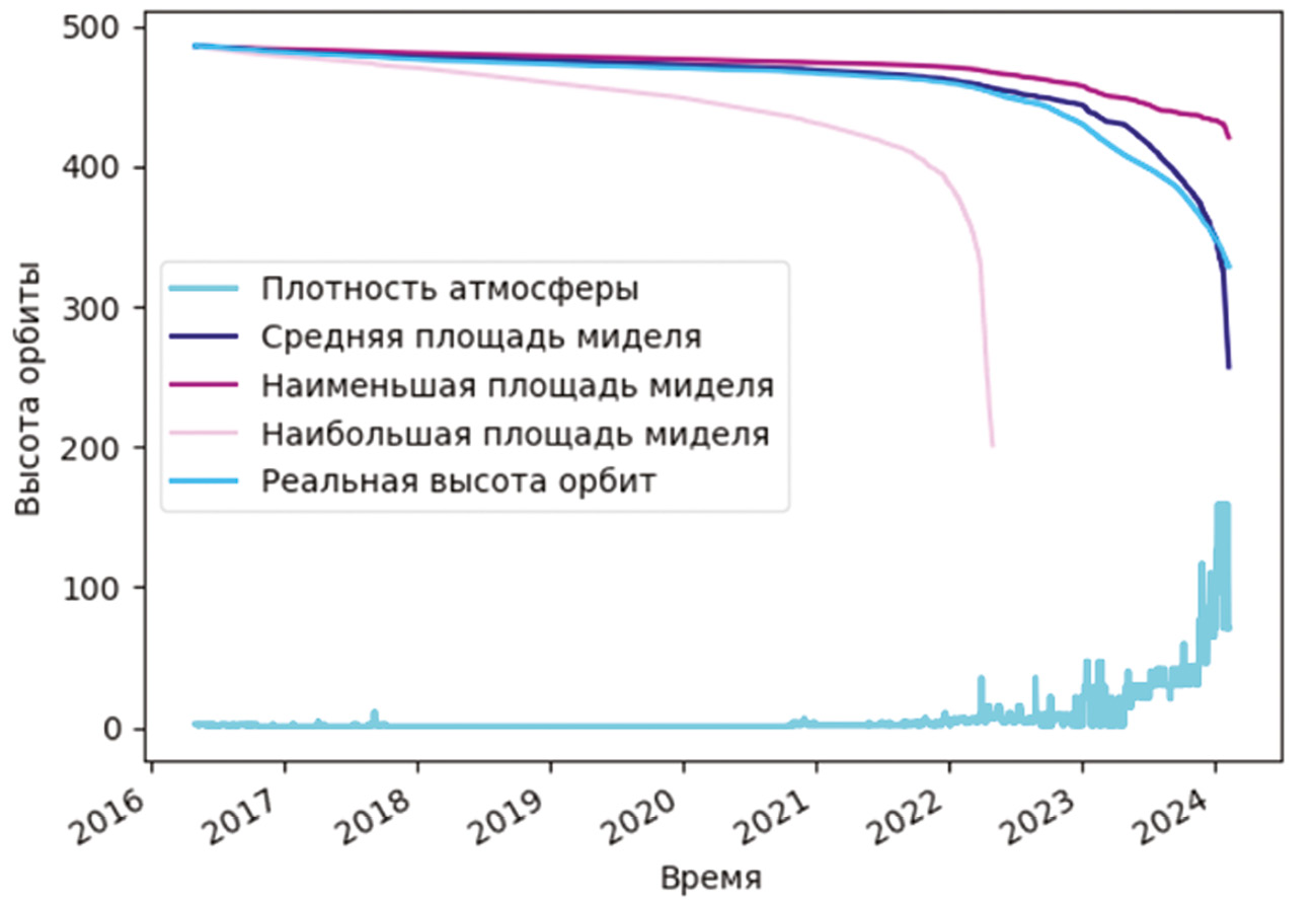 Выводы. В рамках работы проанализировано влияние солнечной активности и плотности остаточной атмосферы на изменение орбитальных параметров малых космических аппаратов, функционирующих на низких околоземных орбитах. В качестве примера рассматривался малый космический аппарат «АИСТ-2Д». Доказано, что применение разработанной циклограммы функционирования и соответствующих режимов ориентации позволяет увеличить срок баллистического существования МКА «АИСТ-2Д» на 278 дней. Данная работа может быть использована студенческими конструкторскими бюро для увеличения срока баллистического существования МКА без корректирующих двигательных установок.