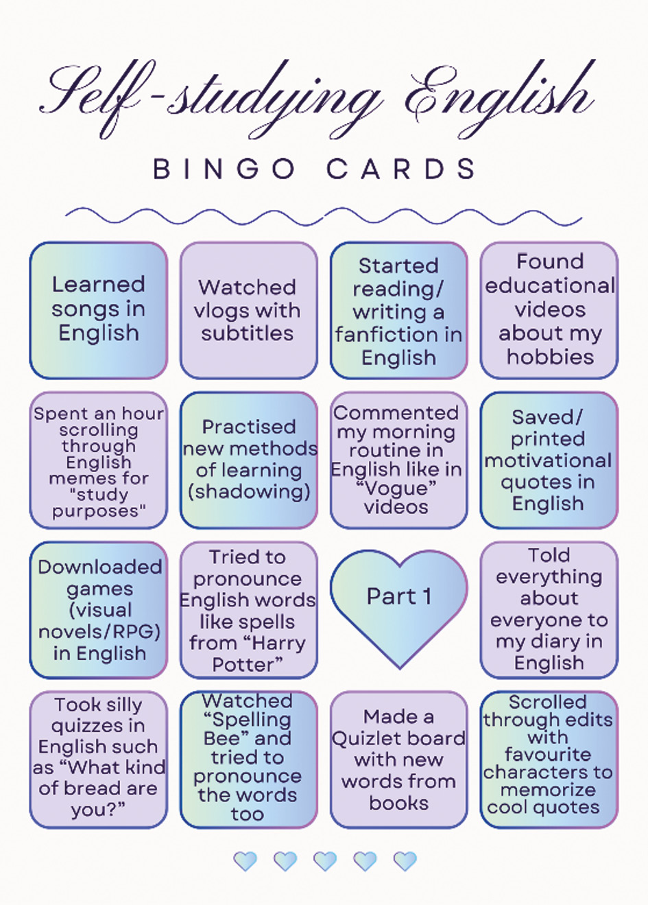 Conclusions: Overall, self-studying English offers both exciting opportunities and challenges. It allows learners to adapt their language learning experience to their personal preferences and academic goals, making it a flexible and enjoyable way to improve proficiency. By using modern tools learners can be encouraged to learn while expanding their understanding of both formal and informal language use. The creation of bingo cards further enhances the process, offering a fun and engaging way to track progress and stay motivated.