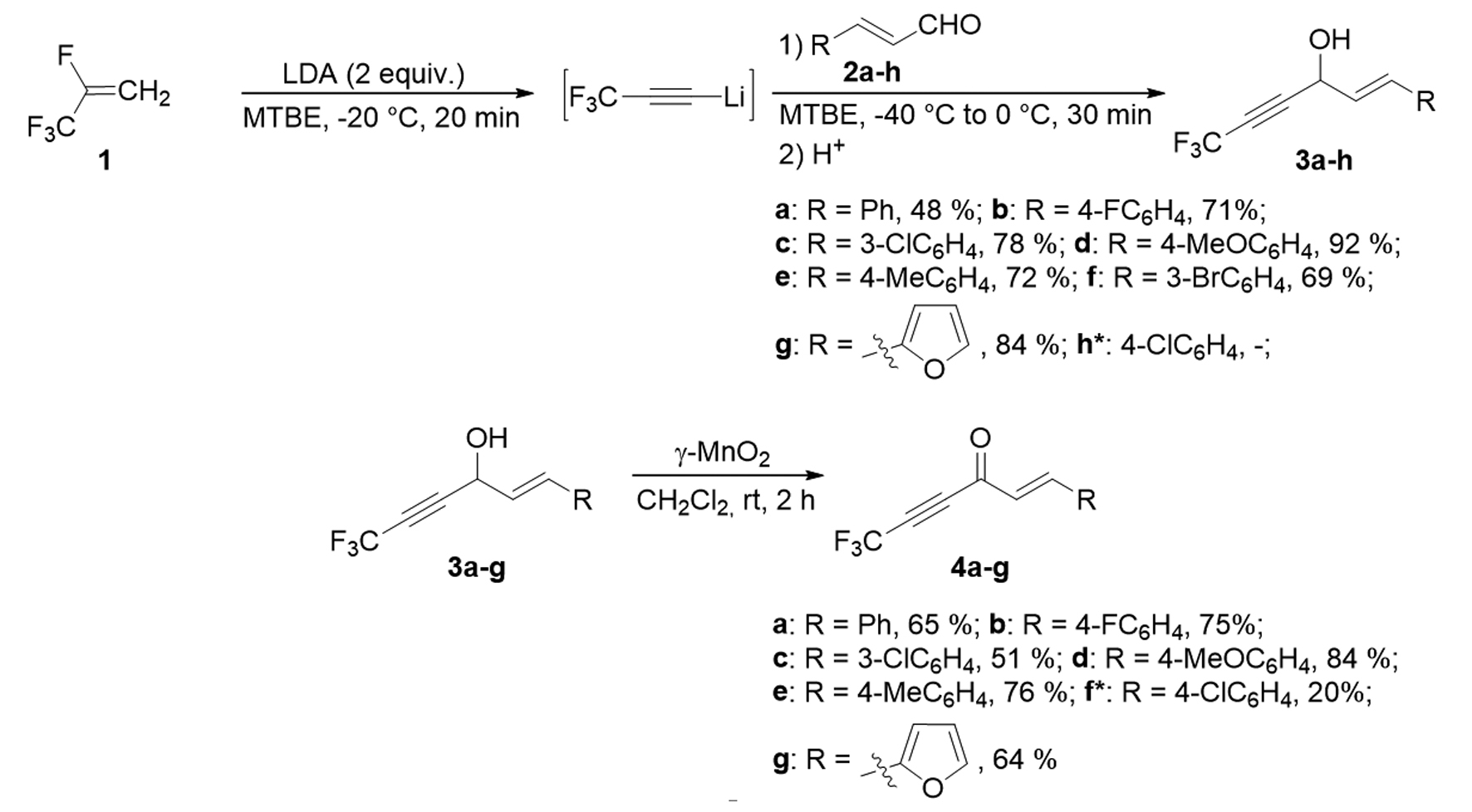 Методы. В литературе описан метод получения CF3-содержащих инонов, где первой стадией является получение карбинолов из доступного фреона 2,3,3,3-тетрафторпропена (HFO-1234yf), диизопропиламида лития (LDA) и соответствующих арил- и алкилзамещенных альдегидов, а вторая стадия — их окисление до инонов [3]. Данный метод был использован для получения кросс-сопряженных CF3-содержащих енинонов с применением соответствующих коричных альдегидов. Впоследствии проведены реакции полученных енинонов с нуклеофилами, где реакция с анизидином показала неожиданный результат — циклизацию с получением CF3-замещенных дигидропиридинонов. Также этим методом были получены трифторпропин, диэтилацеталь трифторбутиналя и сам трифторбутиналь.
