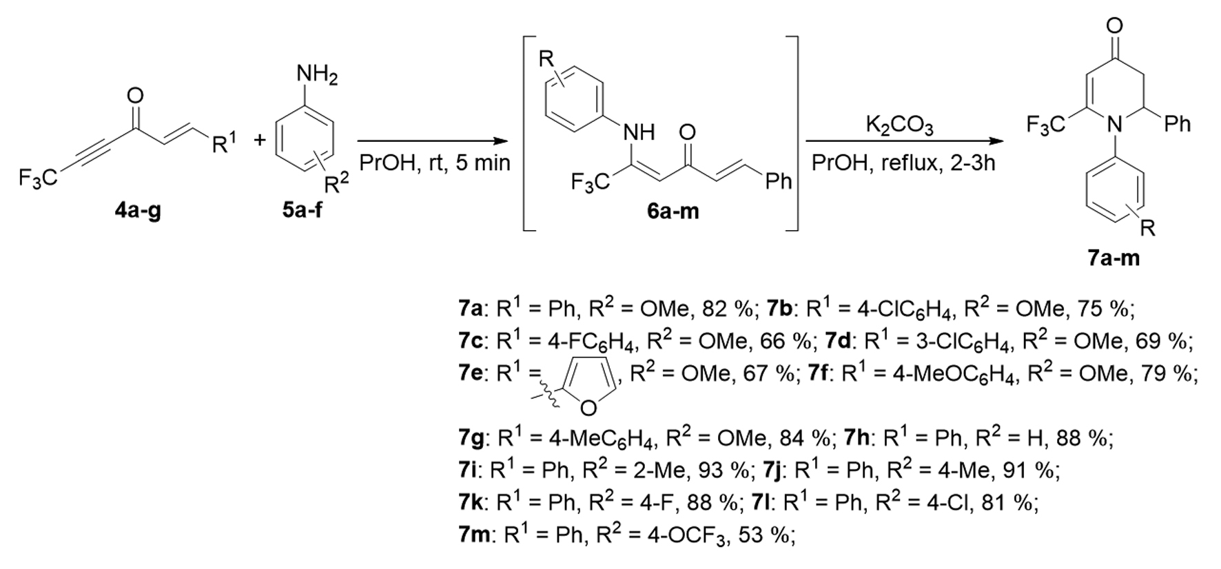 Затем были получены аддукты по тройной связи фенил-замещенного CF3-енинона 4a и нуклеофилов: морфолина, тиокрезола, анизидина с высокими выходами — 83 %, 89 % и 87 % соответственно. В реакции с анизидином методом 1H ЯМР-спектроскопии было обнаружено наличие другого соединения — продукта циклизации, дигидропиридинона, что представляет значительный интерес с синтетической точки зрения. В продолжение данного исследования дополнительно были получены с высокими выходами дигидропиридиноны, варьируя заместители в CF3-енинонах и анилинах (рис. 2), путем добавления поташа в качестве основания и кипячения реакционной смеси в течение 2–3 часов.