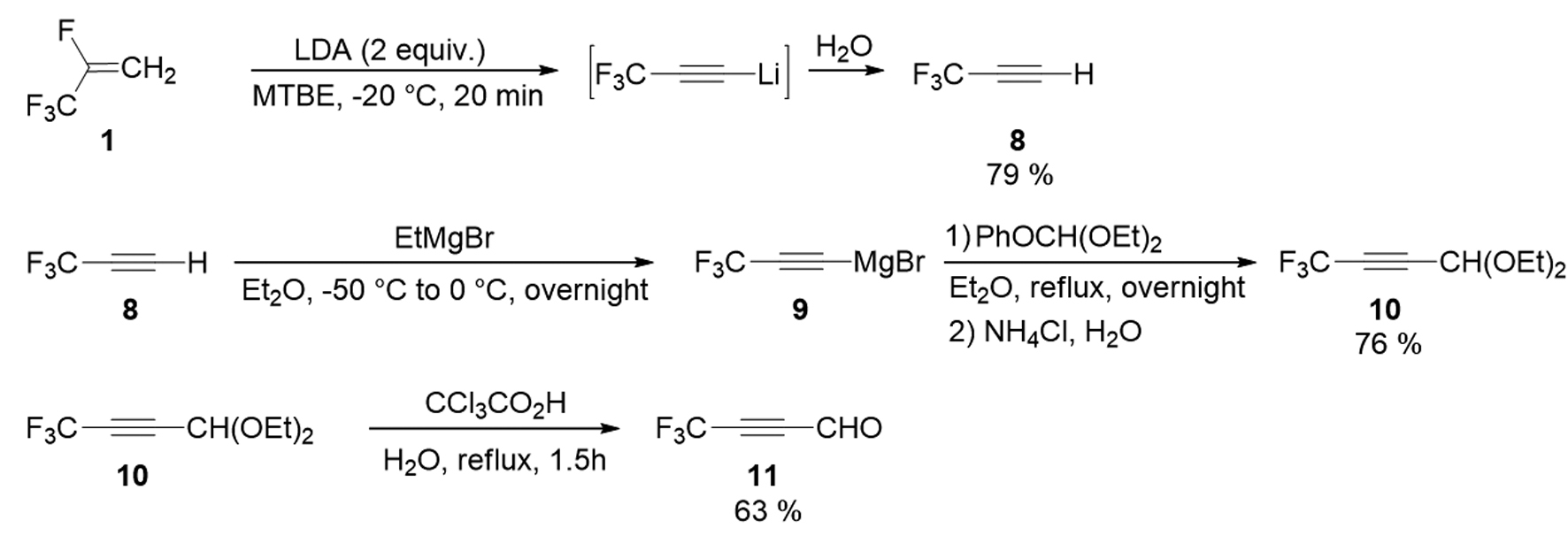 Дополнительно была проделана работа в направлении получения линейно-сопряженных CF3-енинонов. Для этого из фреона 1 был получен трифторпропин 8, который был превращен в реактив Йоцича 9 и затем в диэтилацеталь трифторбутиналя 10. Ацеталь был гидролизован с получением трифторбутиналя 11 — ценного прекурсора для органического синтеза с выходом 63 % (рис. 3). Стоит отметить, что синтез трифторбутиналя 11 ранее описан только в одной статье [4], методом вакуумного пиролиза CF3-замещенных фосфоранов с образованием сложноразделимой смеси 2:3 альдегида и кетона, с выходом смеси продуктов в 60 %.