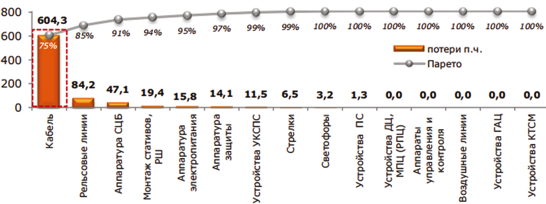 Рис. 1. Распределение Парето отказов технических средств железнодорожной автоматики и телемеханики 1,2 категории по устройствам